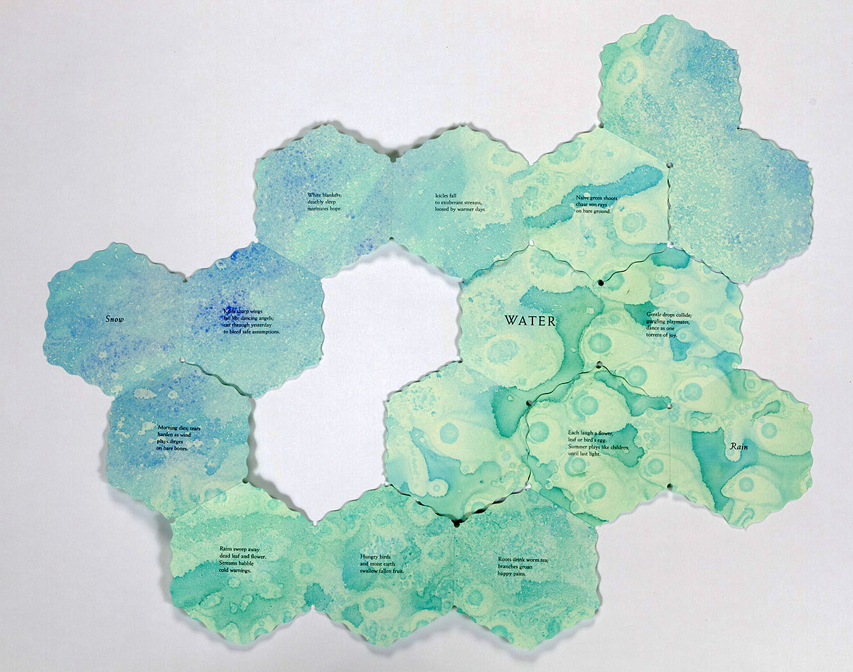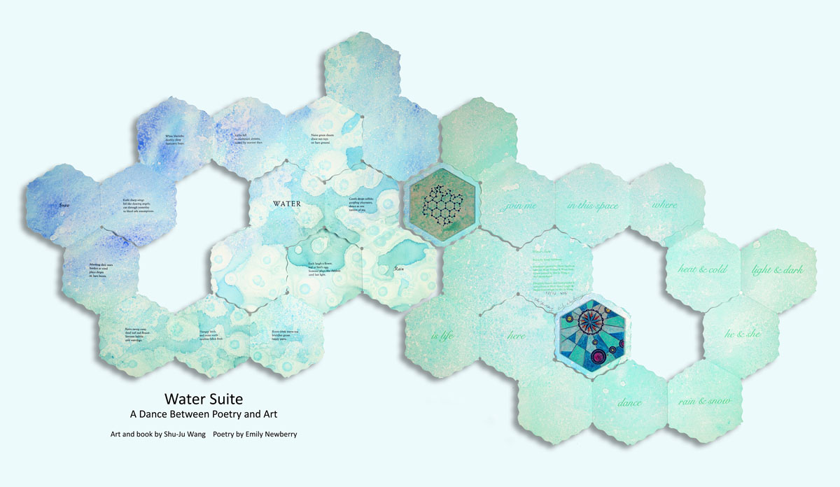 Artist’s book Water. Art and book by Shu-Ju Wang, poetry by Emily Newberry. Limited edition hand-made book, Meandering Book structure with hexagonal pages so the book lays flat when opened fully. The book uses letterpress, Print Gocco (silkscreen), and painting to create an edition of 40 books. The main poem reads in the round and has no beginning or ending. Shu-Ju silk screened, painted and bound the books by hand. Individually numbered and signed by the artist and poet. Cost $400.00. Email below for details.